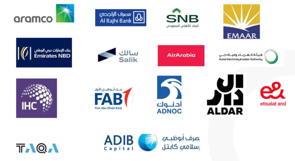 Examples include Saudi Aramco, Al Rajhi Bank, Saudi National Bank, Emaar Properties, Emirates NBD, Salik, Air Arabia, Dubai Electricity and Water Authority (DEWA), International Holding Company (IHC), First Abu Dhabi Bank (FAB), ADNOC Drilling, Aldar Properties, Etisalat, TAQA, and Abu Dhabi Islamic Bank.
